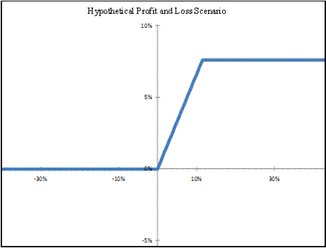 This note captures 76% of the upside while protecting the first 20% of the downside. If the market was up 20% the note would capture 15.2%. If the market should drop more than 20% by maturity the portfolio will capture only ½ of the loss of the market below 20%. For example, if the markets were down 30% at maturity the portfolio will be down 5%. The note protects the first 20% and only captures ½ of the next 10% which would be 5% total loss when the market is down 30%.