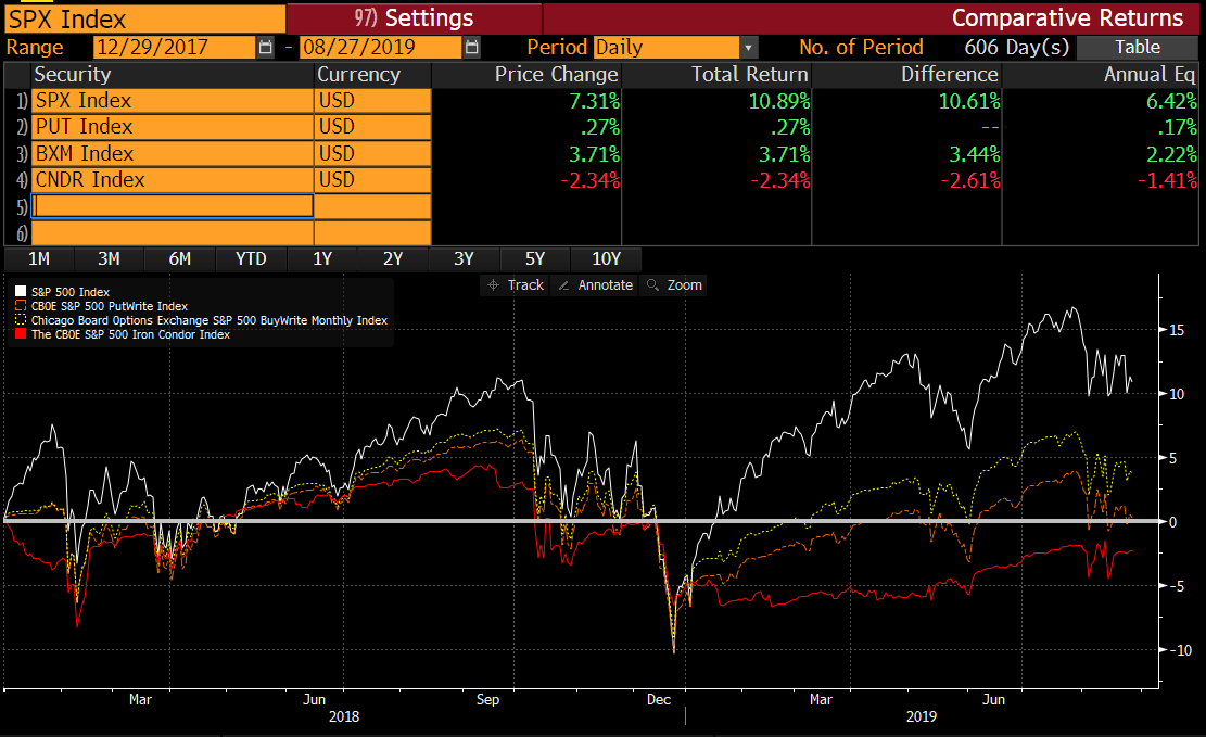 The following chart shows how the three most popular options premium-selling indices (PUT, BXM and CNDR) ex-post performance from 1990 to 2009. Note how these indices would have nicely outperformed the S&P 500.